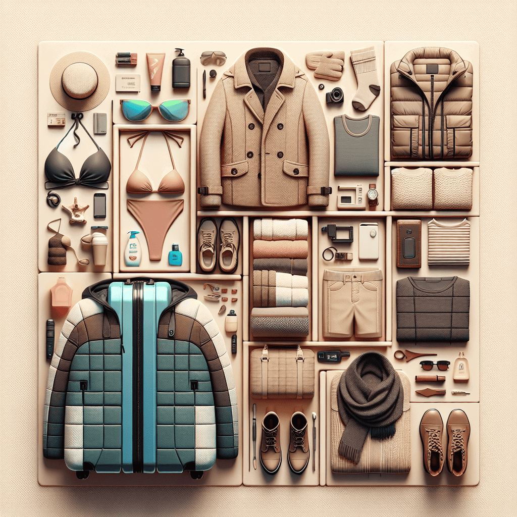 For my upcoming vacation, I'm packing essentials for various climates: a swimsuit, sunscreen, and flip-flops for the beach; a heavy coat, boots, and gloves for the mountains; and a light jacket, walking shoes, and a hat for the city.