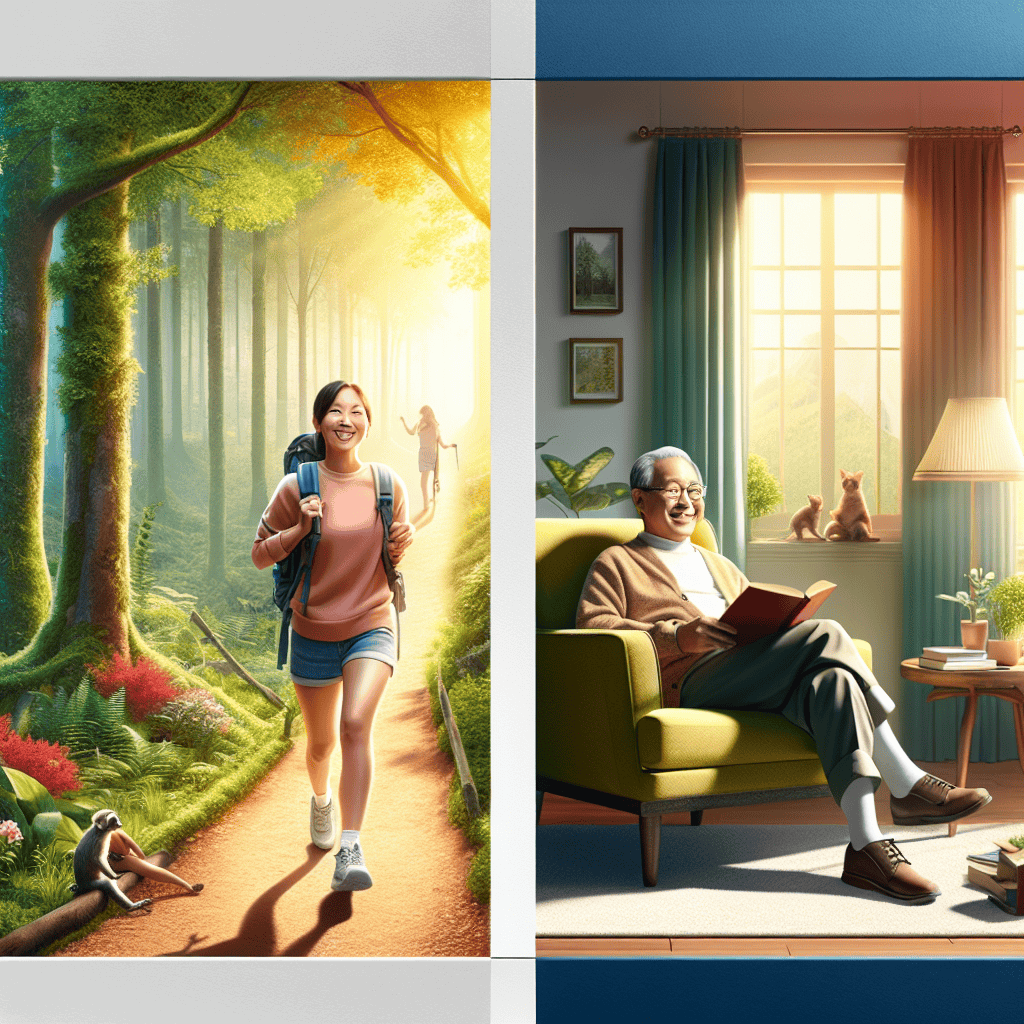 On the left, a young woman is hiking through a lush, sun-drenched green forest, expressing her love for the outdoors; on the right, a man is seated in a cozy armchair indoors, engrossed in a book under warm ambient lighting, illustrating his preference for staying at home.