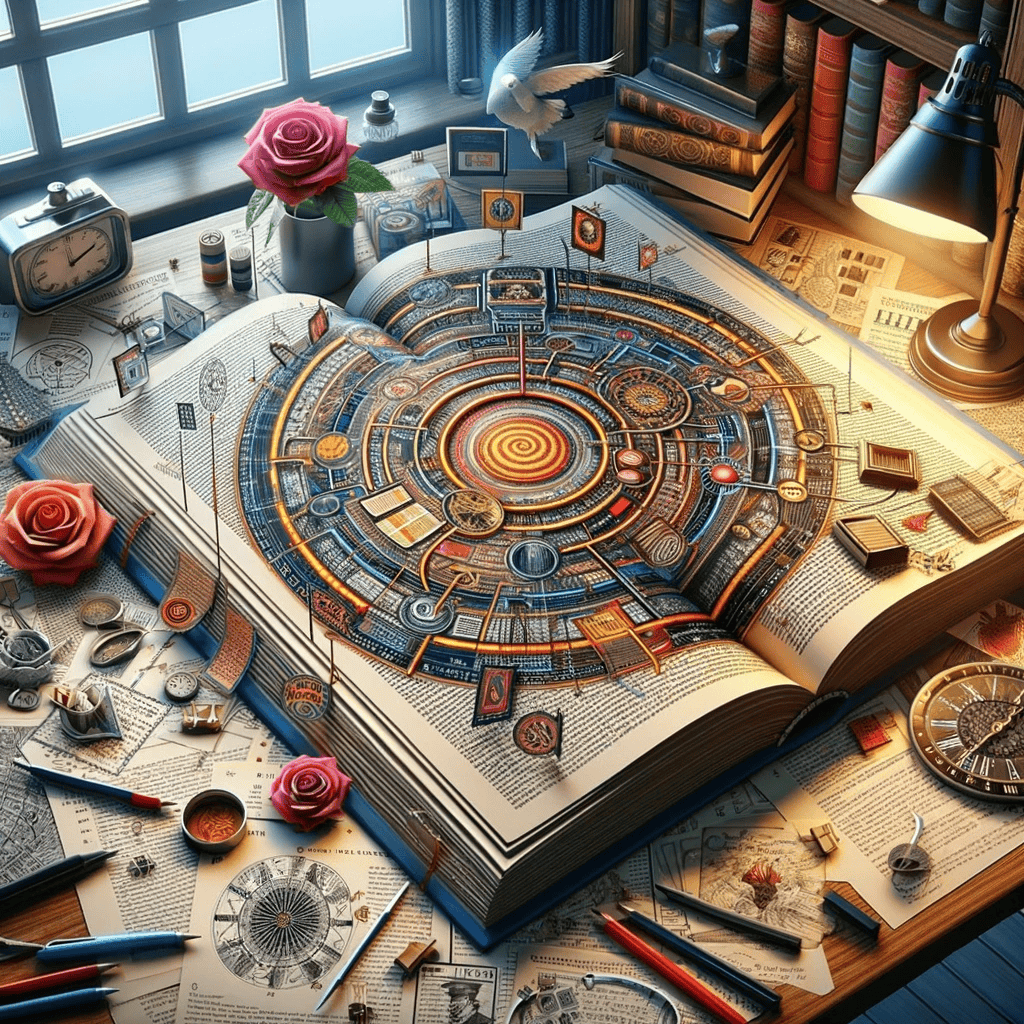 the process of analyzing literature with a focus on structure, patterns, and symbols; features an open book with highlighted sections and annotations, surrounded by symbolic objects