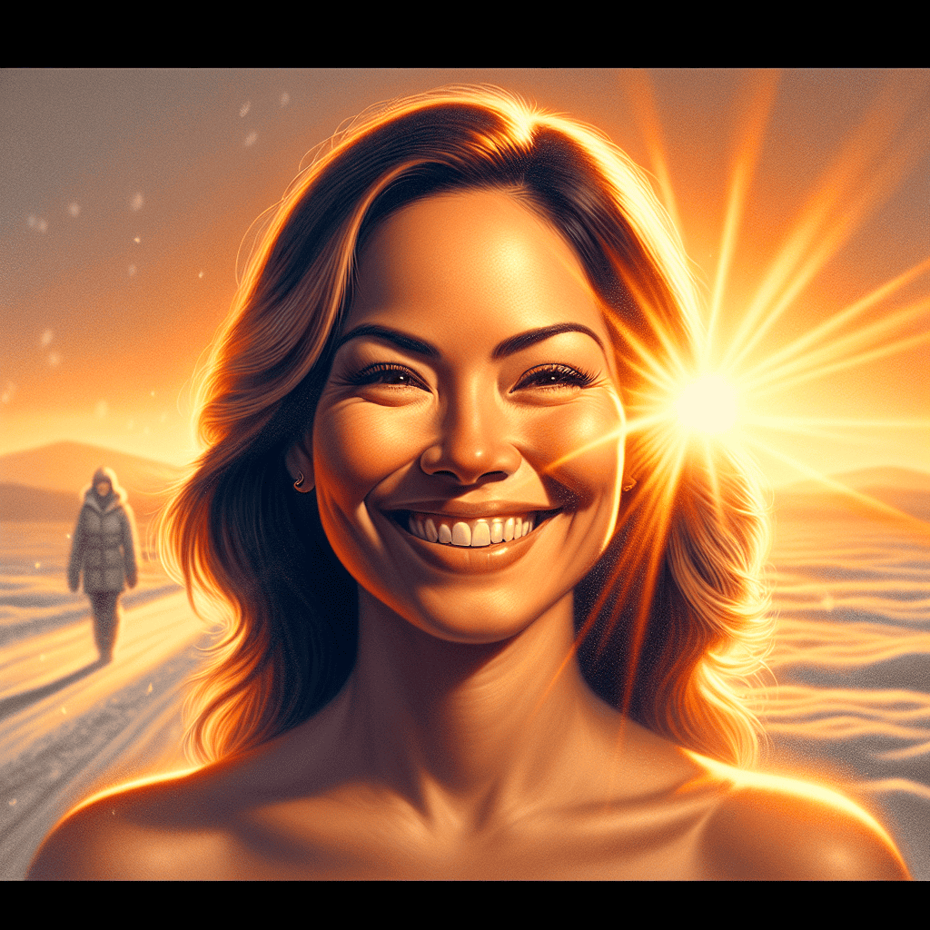 A woman whose smile is the embodiment of warmth and happiness illuminates the scene with an almost tangible sense of sunshine