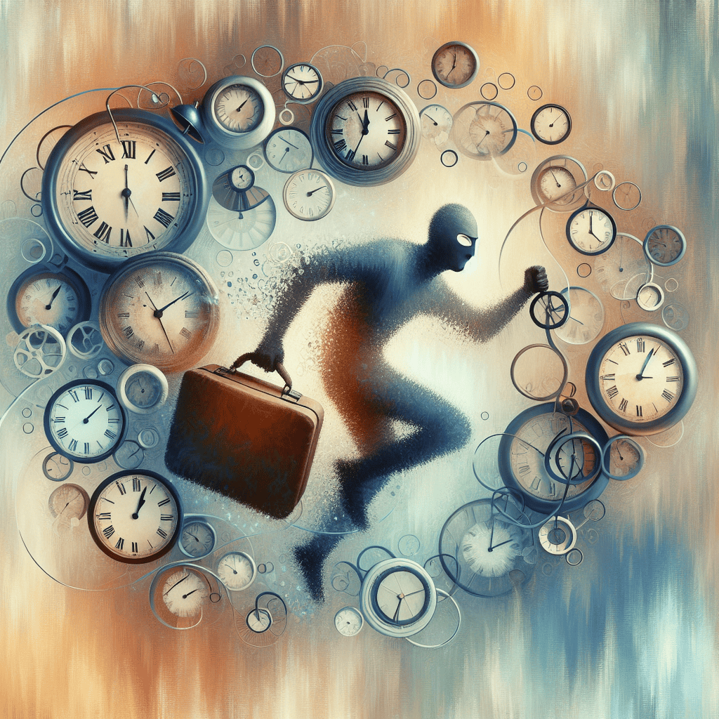 Time is a thief: Time is personified as a thief made up of clock elements, subtly conveying the idea that time steals moments from us