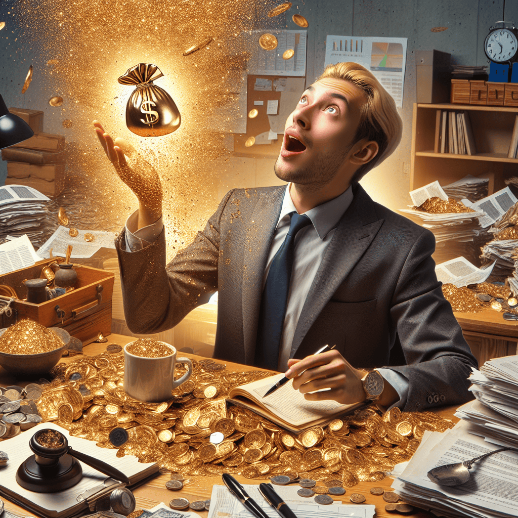 He got a Midas touch: An individual at a desk with everyday items, some of which have partially transformed into gold. This portrayal draws on the well-known story of King Midas, whose touch reputedly turned objects to gold.