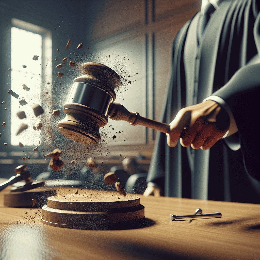 A courtroom scene focused on the judge’s gavel as it impacts with significant force; Small fragments are depicted scattering from the point of impact, symbolizing the shattering of silence by the final verdict, much like a hammer