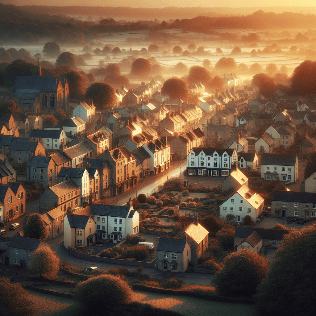 A town at sunrise, gently lit by a soft golden light, embodying the concept of using clear and straightforward figurative language to convey beauty in writing