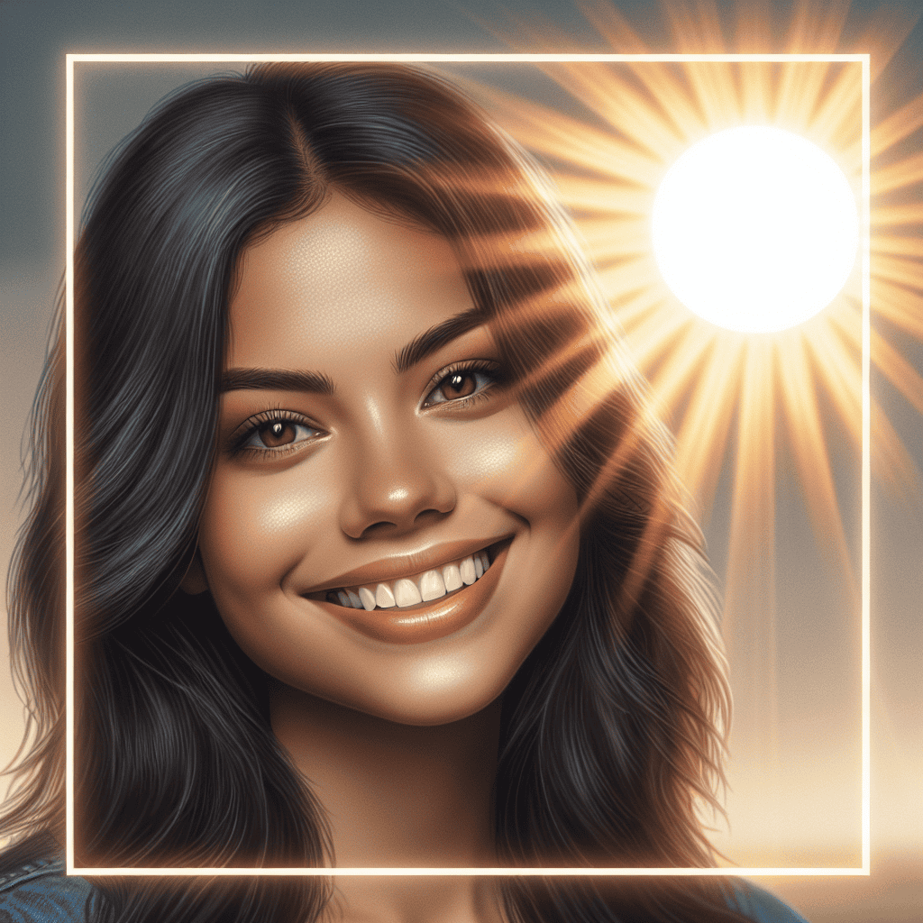 Her smile was as bright as the sun: A young woman with a radiantly bright smile, complemented by the sun in the background, visually illustrating the comparison made in the simile.