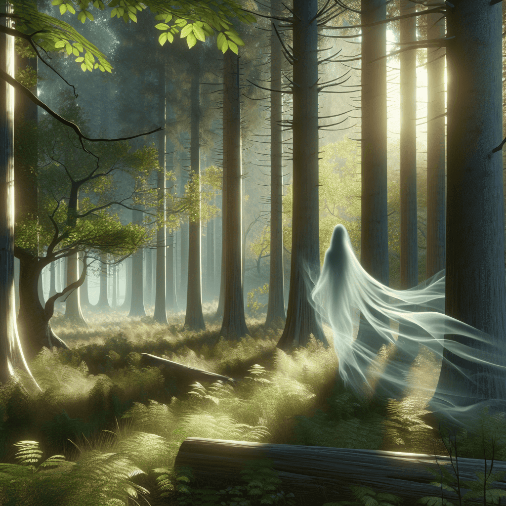 The wind whispered through the trees: A wisp of mist harboring human-like traits moves gently through the trees, subtly embodying the wind in an act of communication with the trees