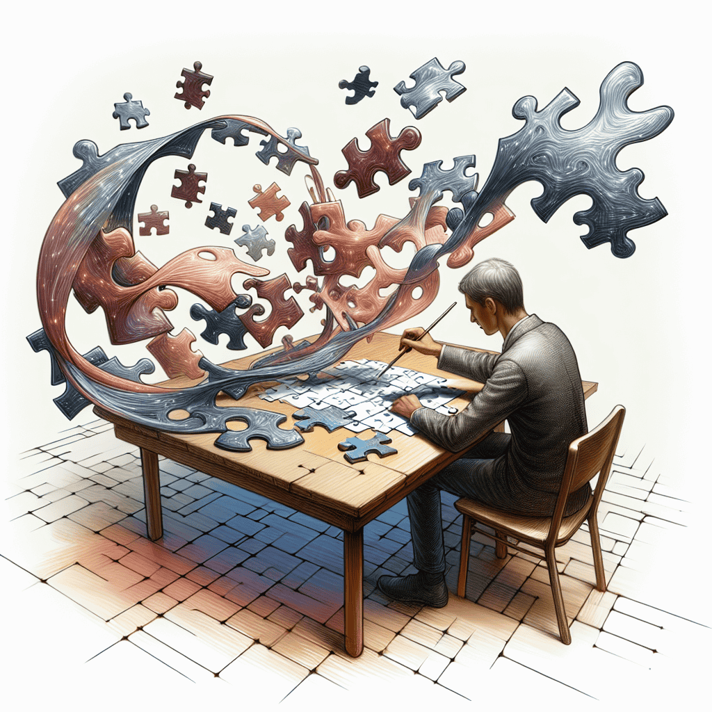 An individual engaged with a jigsaw puzzle, the central theme being the puzzle pieces that are designed to appear as if they are changing shape. This serves as a metaphor for the complexity and fluidity associated with understanding quantum physics.