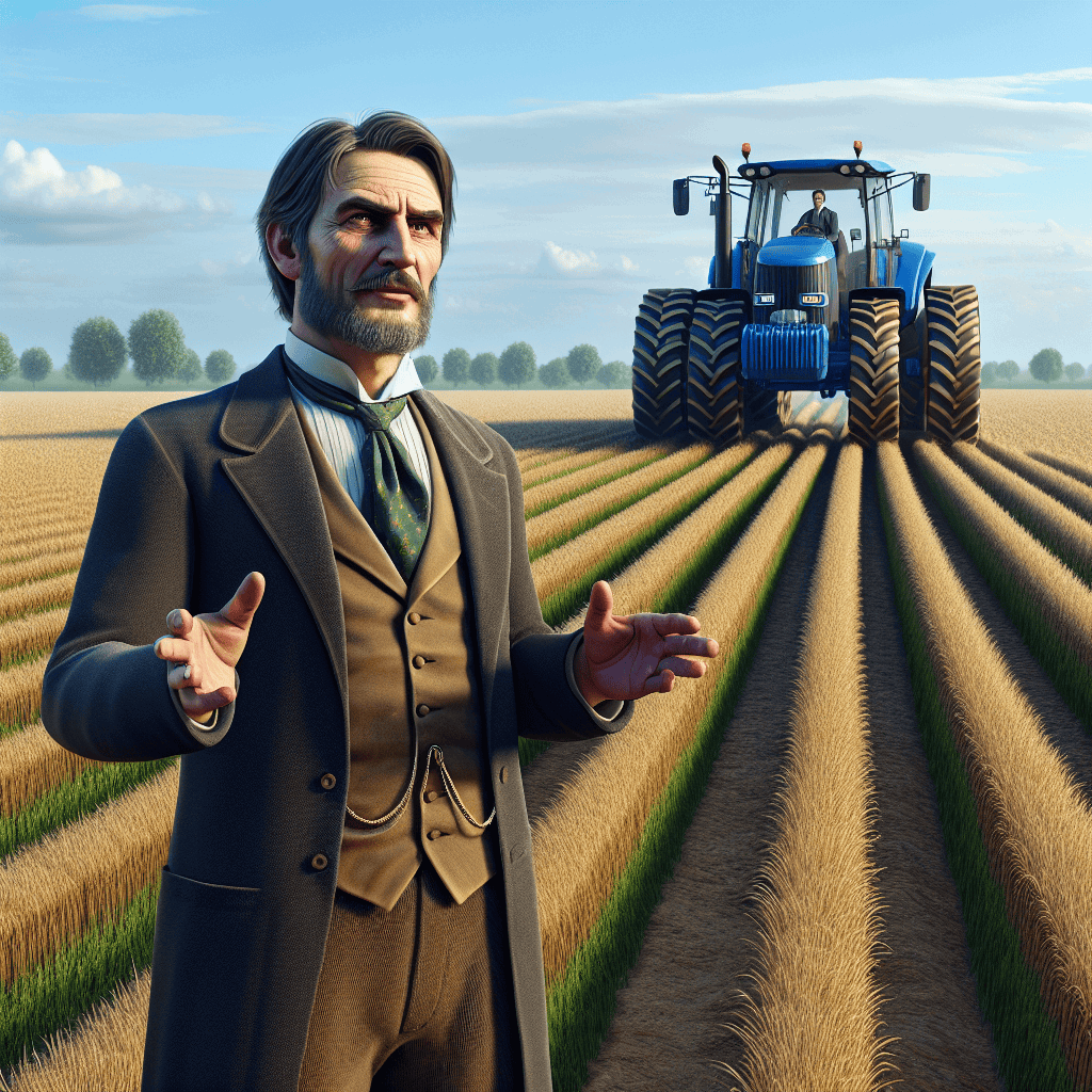 A farmer named John by a new tractor in a field, with an amused expression and using a gesture to suggest the efficient work of the tractor, subtly referenced as ‘eating up the field like a hungry beast.’
