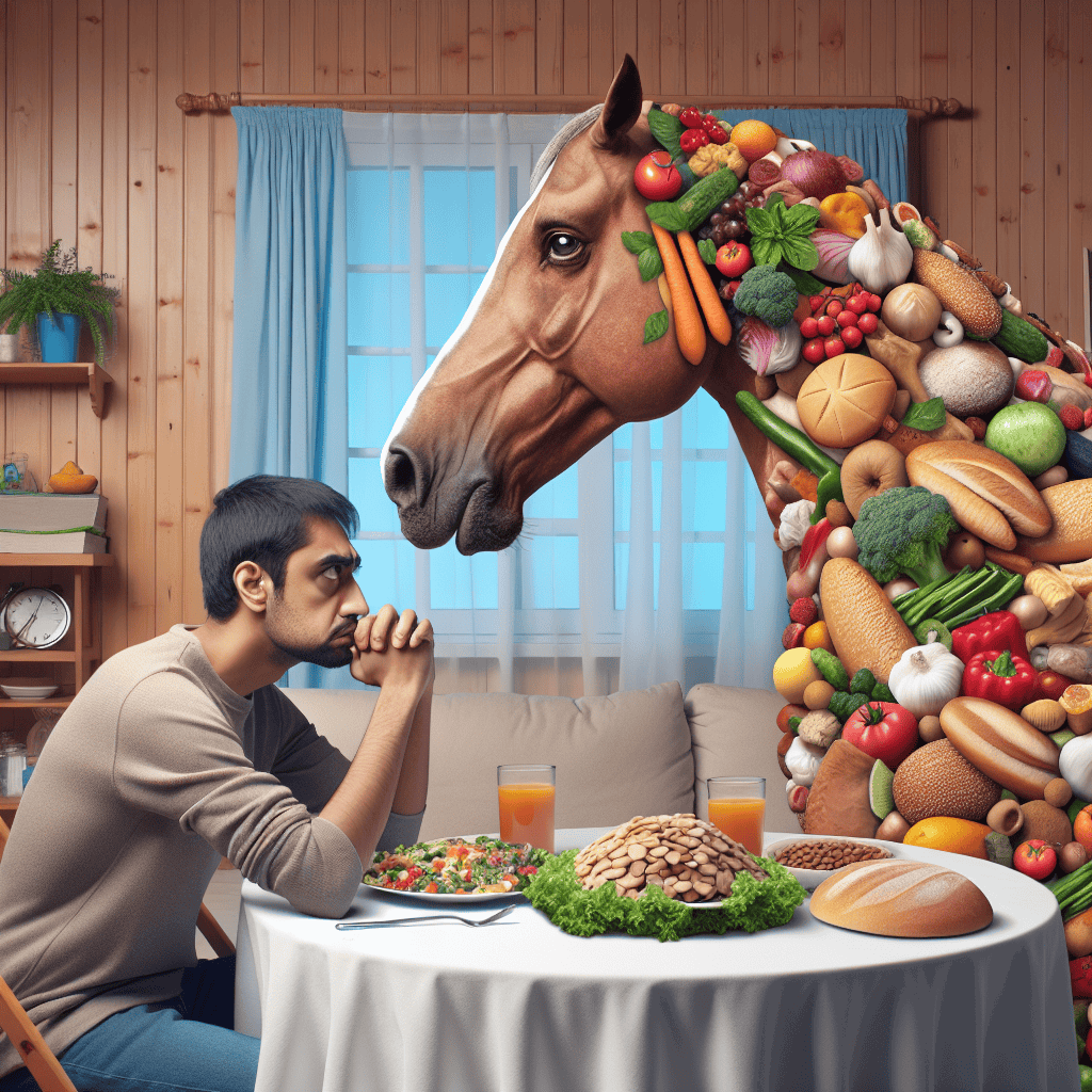 I’m so hungry, I could eat a horse: A person seated at a dining table, staring down at a comically large plate with just a tiny piece of food. The individual’s eyes are cast longingly toward a whimsical culinary depiction of a horse, creatively assembled from various food items.