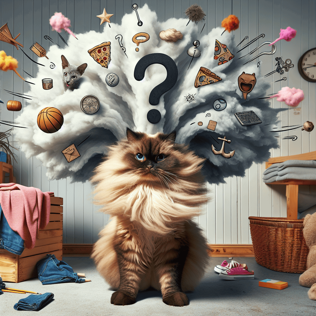 A cat in a domestic environment, humorously depicted as a ‘furry little drama queen,’ with whimsical elements like an exaggerated thinking cloud, indicating its monumental decision-making about where to nap